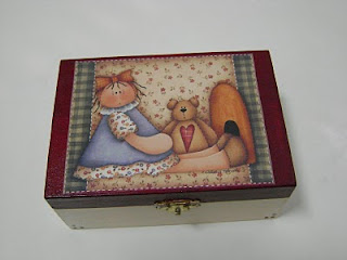Olá, hoje venho mostrar-vos uma caixinha com uma menina e o seu ursinho de peluche. É pequenina, mas levou uns docinhos dentro e ficou uma doce oferta.